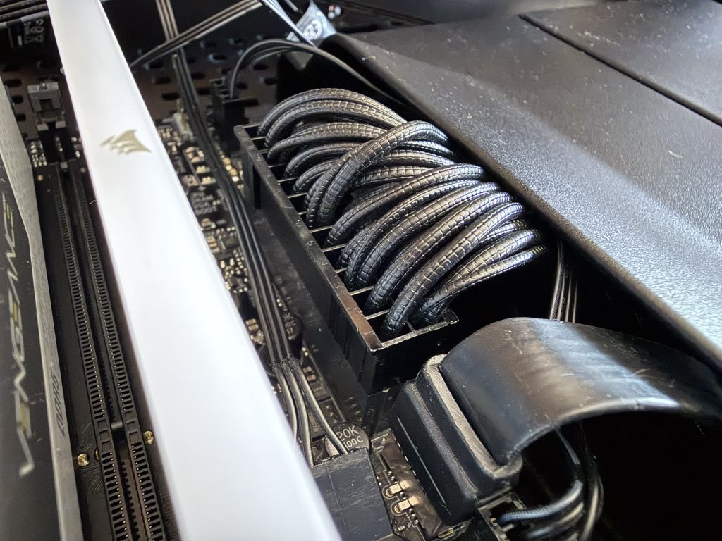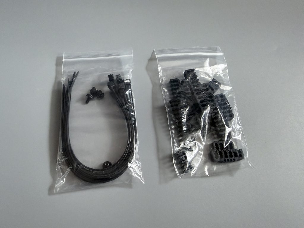 A tápegységhez kapunk gyorskötözőket, négy darab csavart a tápegység gépházba történő becsavarozásához, valamint műanyag megvezetőket, melyekkel a kábelkötegek kábeleit tudjuk esztétikusan eligazítani.