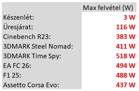 Néztünk maximális fogyasztási értékeket is készenléti módban, Windows alatt, Benchmark alatt és játékok futtatása közben is: