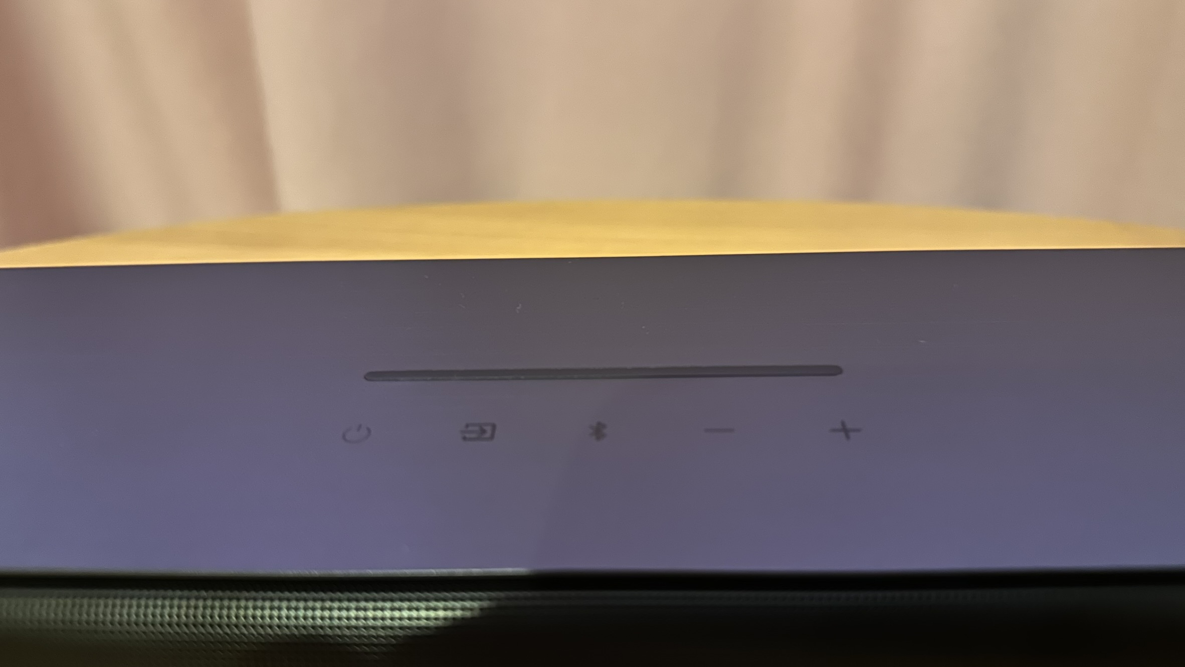 A felső részen, középen elhelyezve találjuk az érintőgombokat, melyek a hangerőszabályzásért , bluetooth kapcsolatért felelnek. Ezen keresztük tudjuk az eszközt be és kikapcsolni, valamint a bemenetek között is itt tudunk váltani. Ez annyit jelent, hogy módunkban áll HDMI eARC, Optikai , AUX, USB és Bluetooth között változtatni, annak megfelelően, milyen csatlakozást igénylünk. Az érintőgombok felett találunk egy LED háttérvilágítással ellátott sávot, ami több szempontból is érdekes megoldás. Elöször is színkódolva vannak a bemenetek, így nem csak mondja az eszköz, milyen csatlakozási módban vagyunk, de eltérő színekkel is mutatja azokat. A hangerő szabályázását és a mély-magas beállítások állapotát is fehér színű LED fény jelzi attól függően, alacsony, vagy magas beállításon vagyunk.